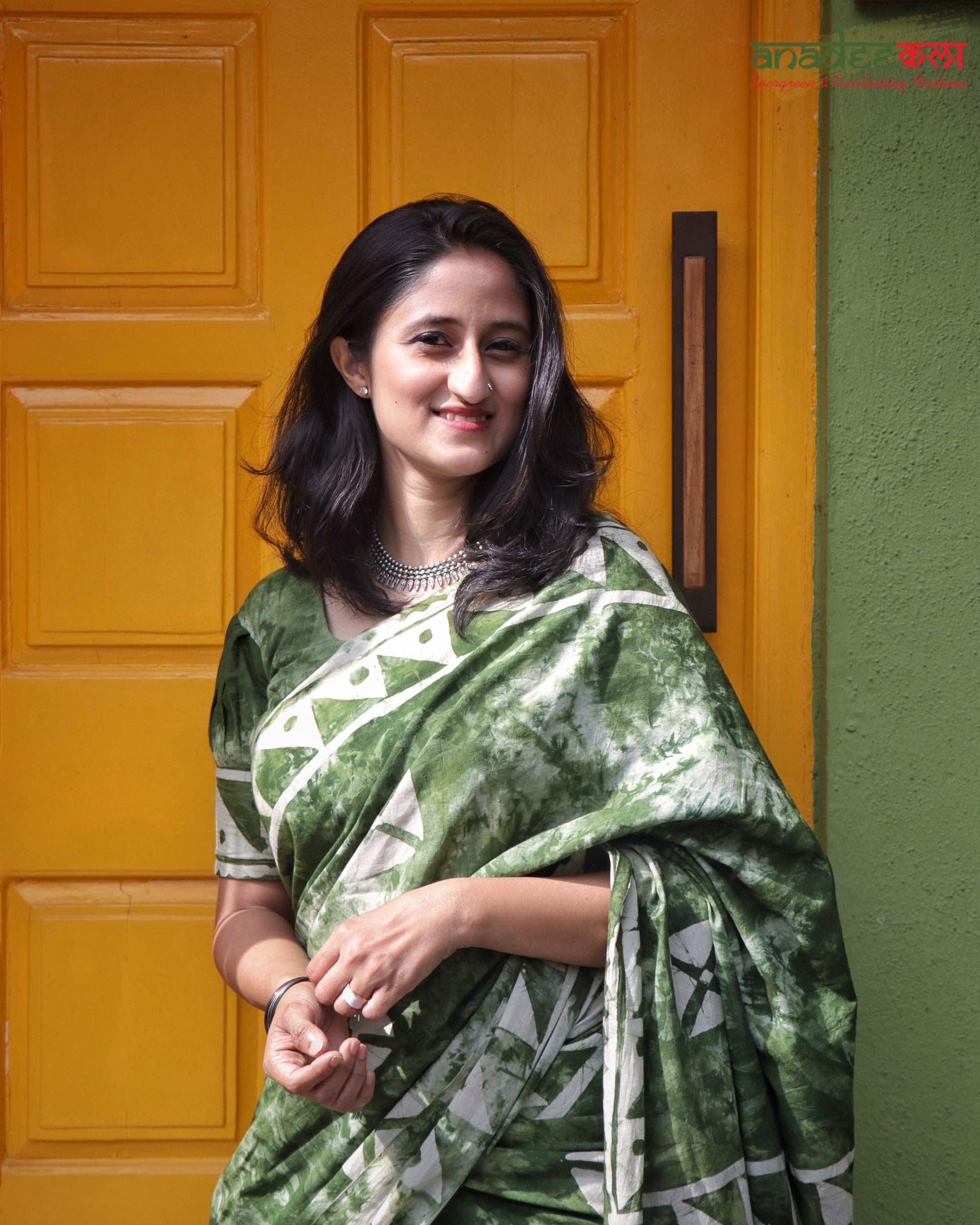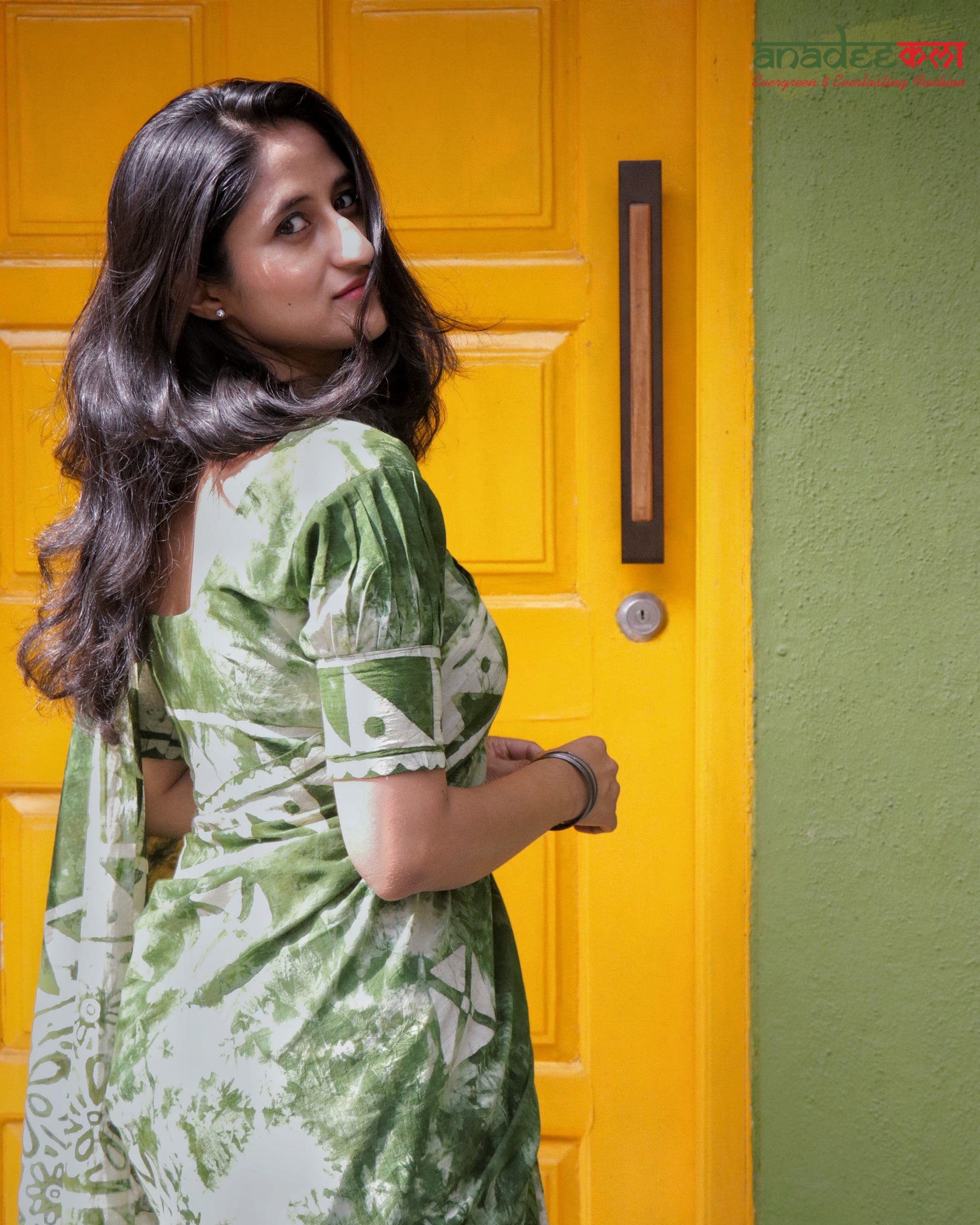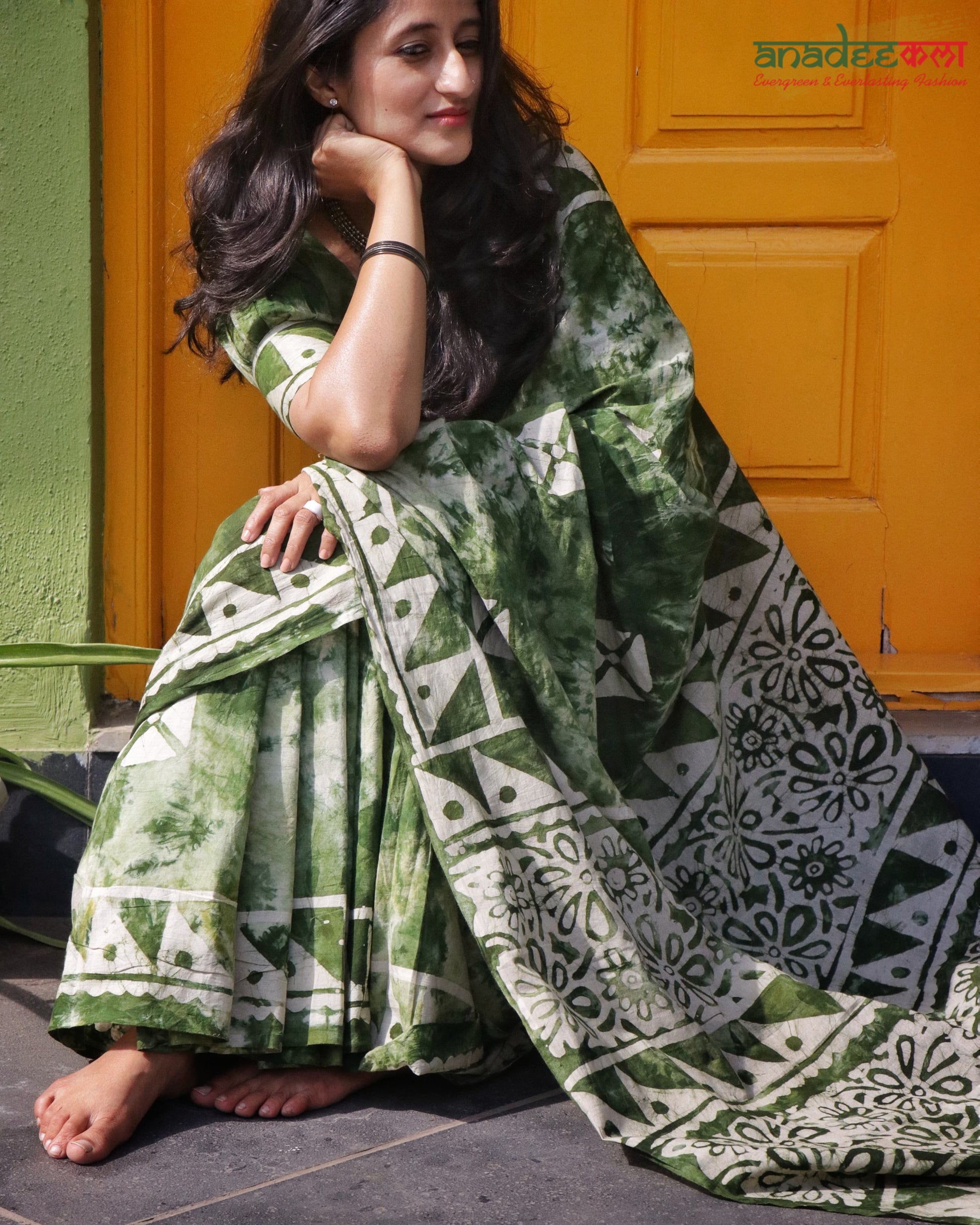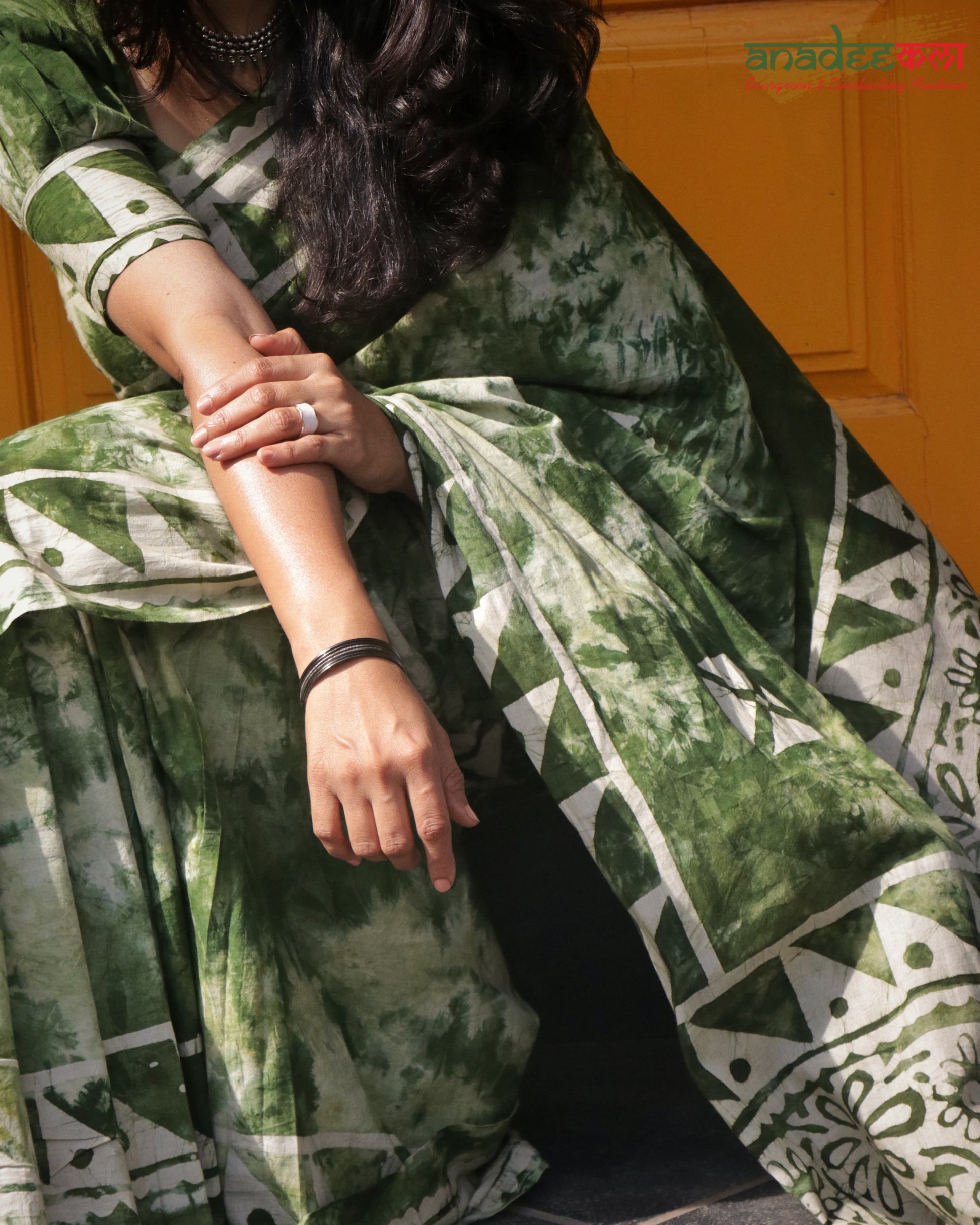 Created using the traditional batik technique, the saree carries organic patterns formed through wax-resist artistry, making each piece one of a kind. The motifs emerge slowly, just as nature does — unhurried, intentional, and deeply rooted. The depth of green feels timeless, evoking foliage after rain, shaded canopies, and the stillness found beneath tall trees.