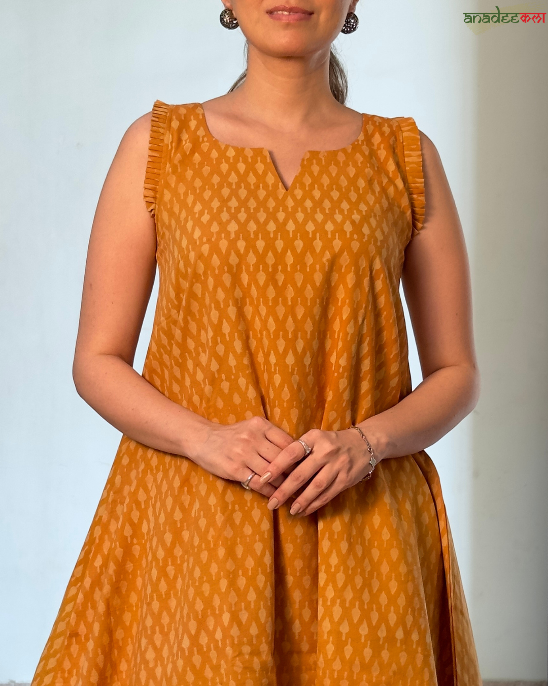 Made from 100% pure cotton, this dress is soft, breathable, and light on the skin — designed to feel like a second layer of comfort. It is dyed using a traditional Haldi (turmeric) dye bath, which gives it its signature golden-yellow glow — a shade long associated with purity, healing, and celebration in Indian culture.