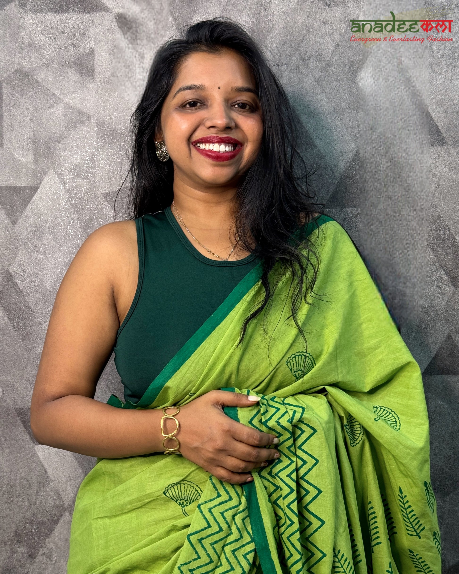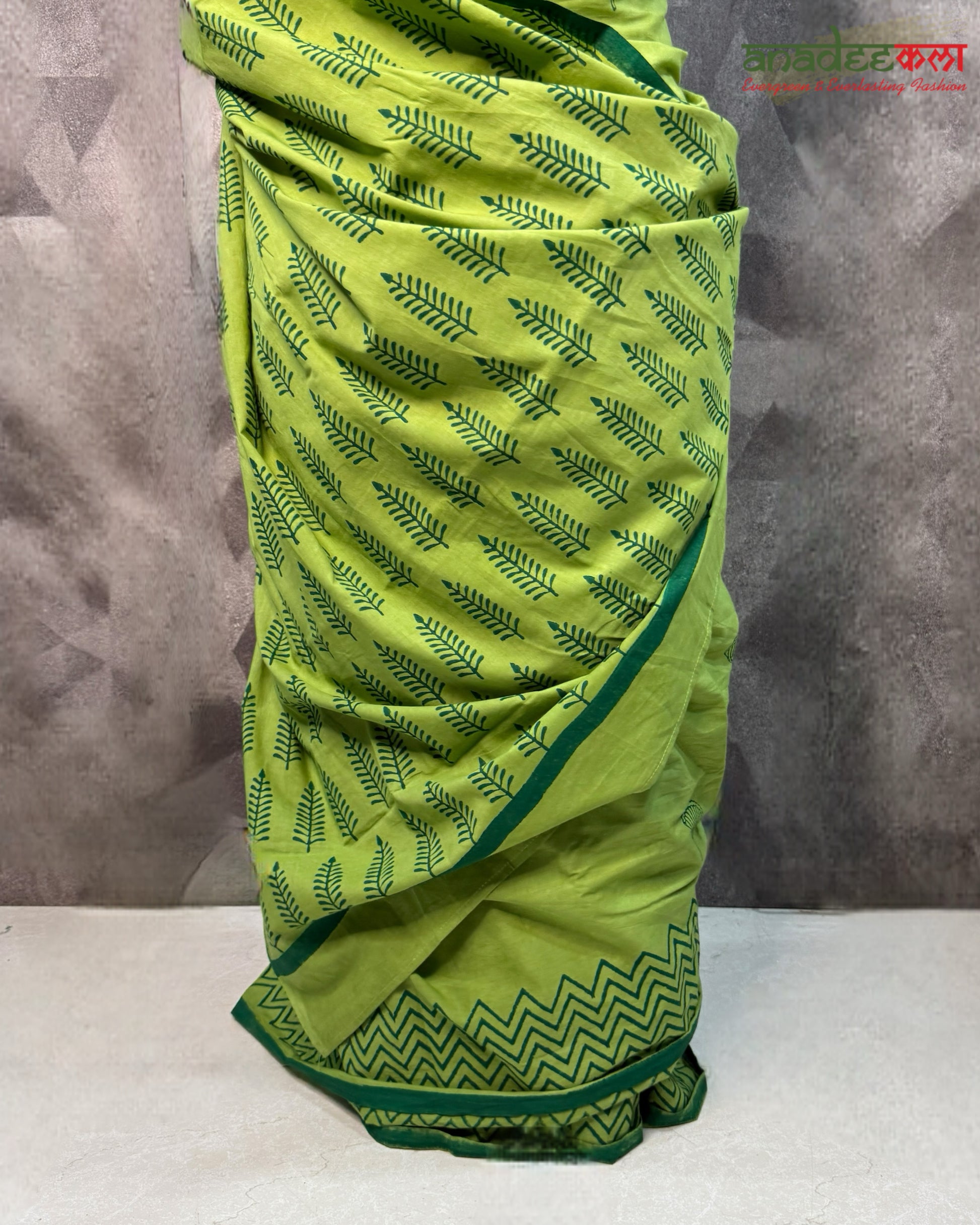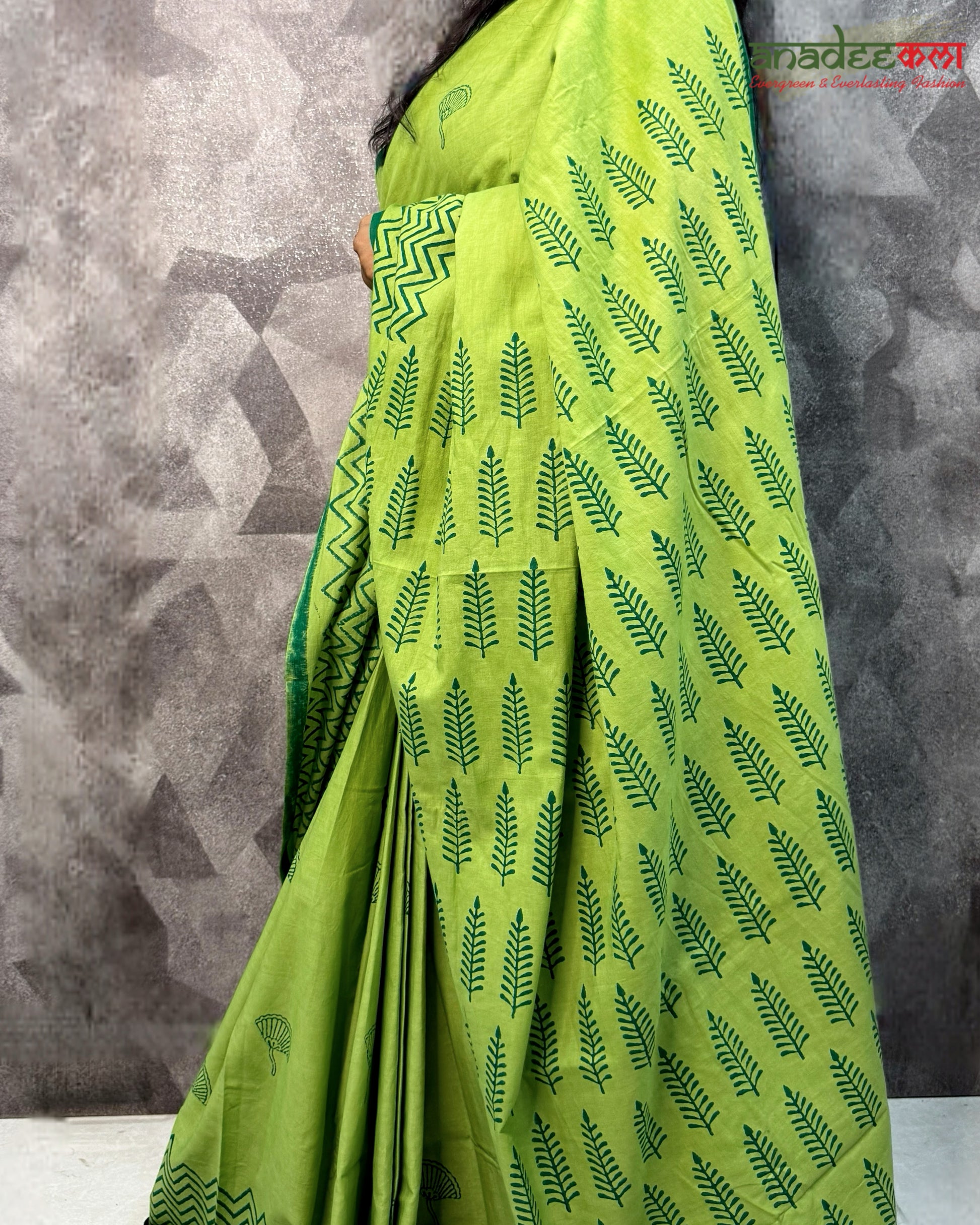 Handblock printed slowly using eco-friendly dyes, the saree carries delicate leaves and geometric motifs — a balance between the organic flow of nature and the structure of design.