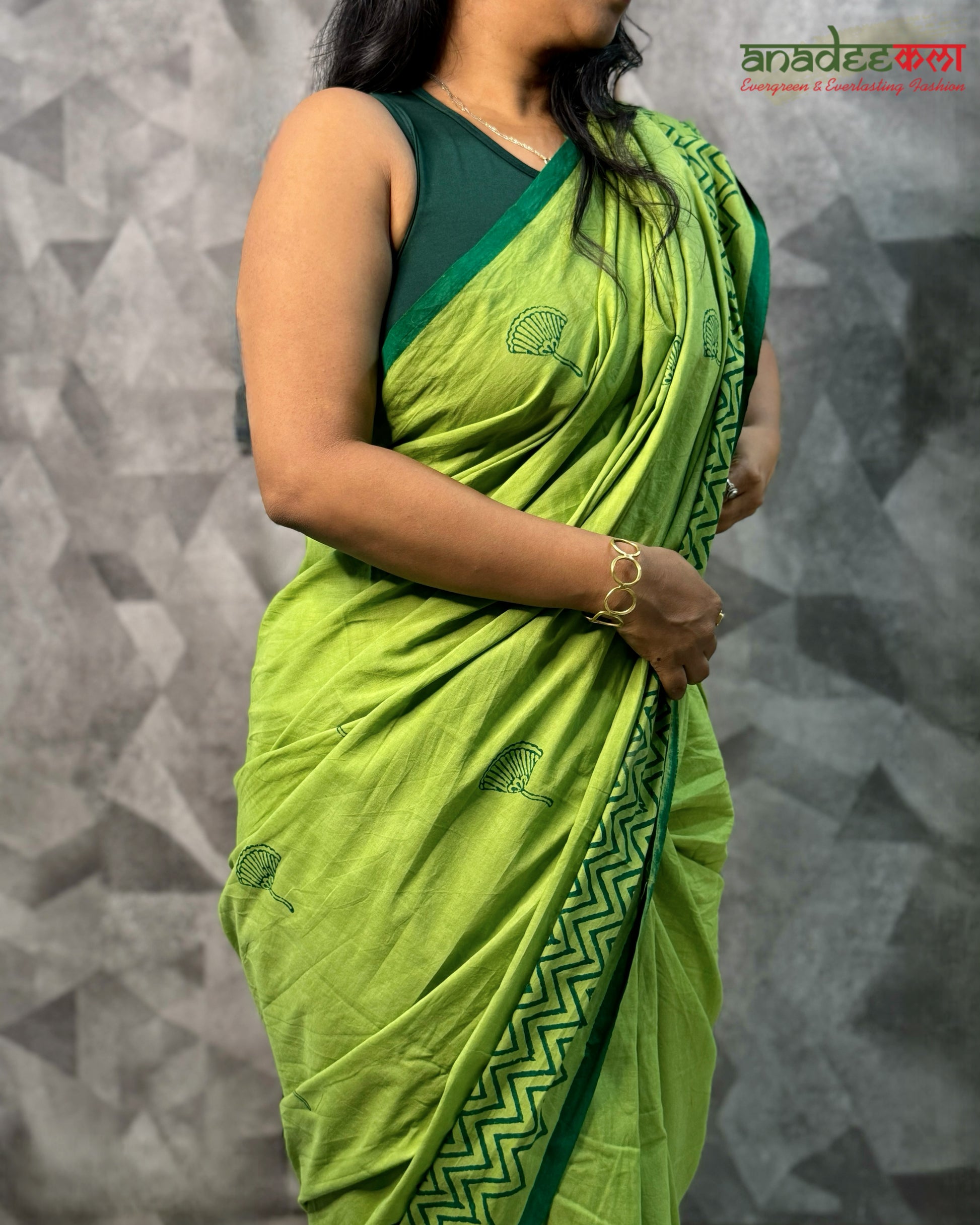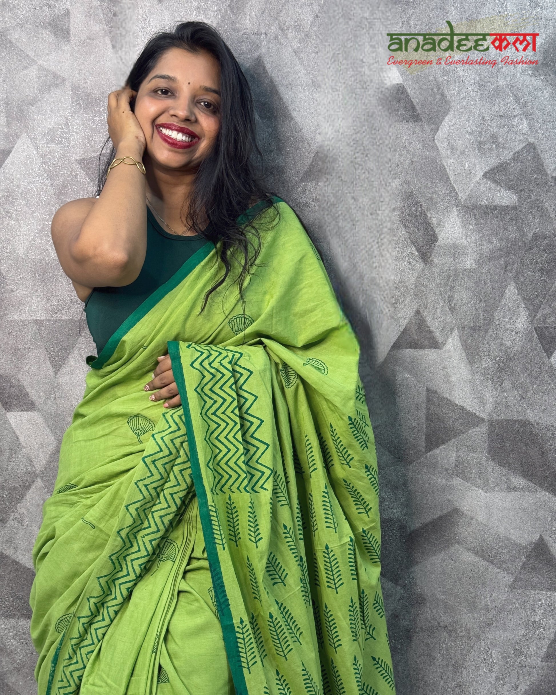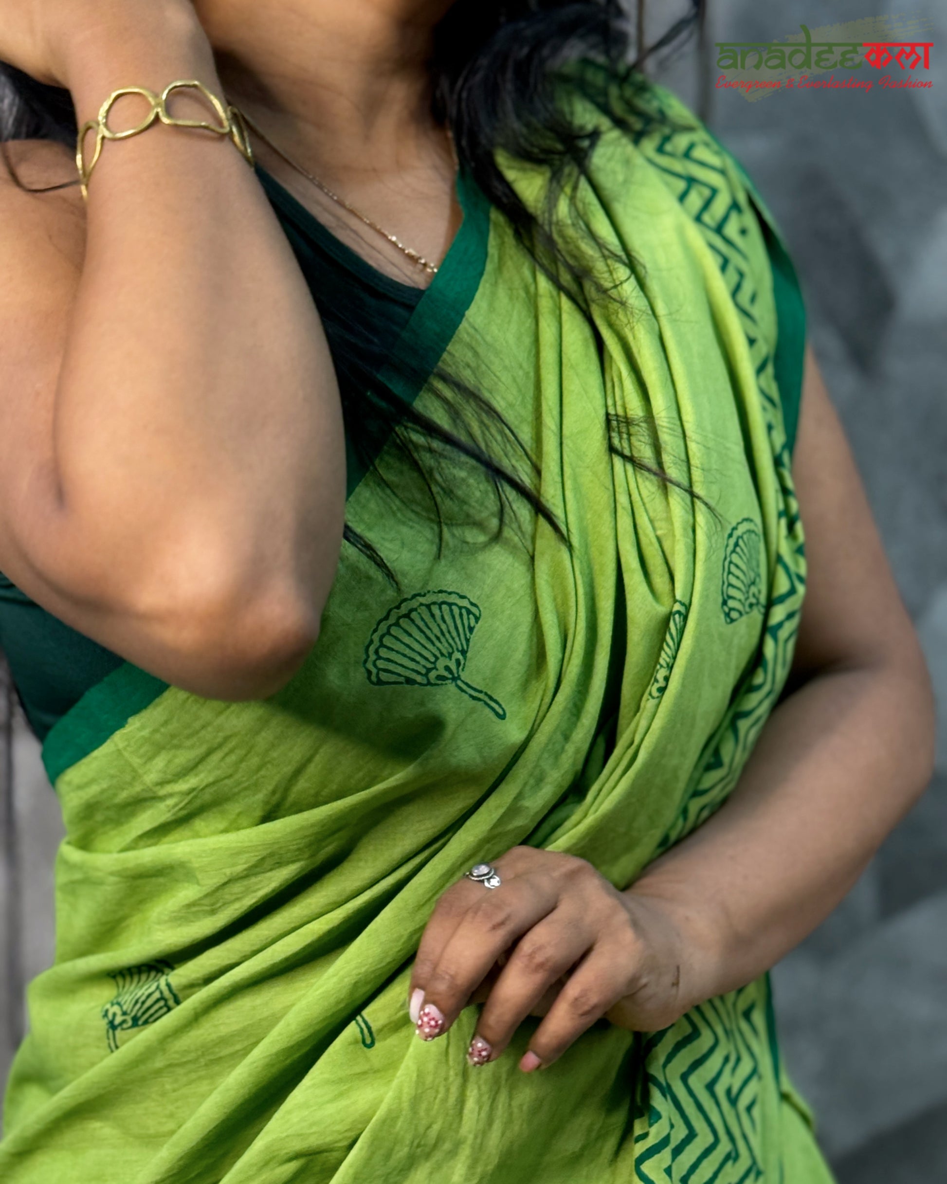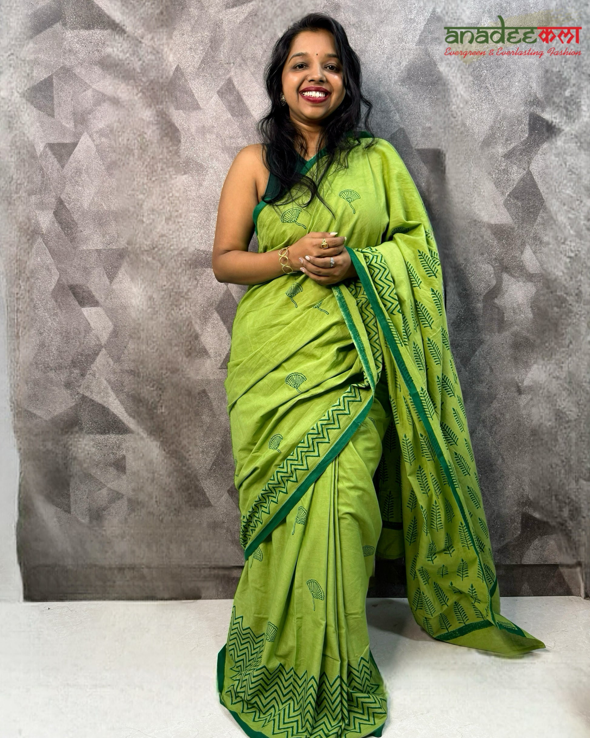 Handblock printed slowly using eco-friendly dyes, the saree carries delicate leaves and geometric motifs — a balance between the organic flow of nature and the structure of design.