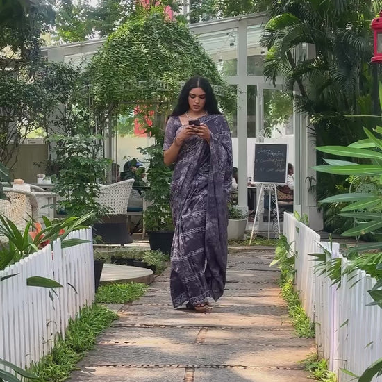 A graceful fusion of heritage craft and mindful fashion, this 100% cotton saree features a soothing Grey tie-dye base, with Hand-block printed brought to life with OEKO-TEX® certified dyes—ensuring every thread is safe for your skin, kind to artisans, and gentle on the planet.